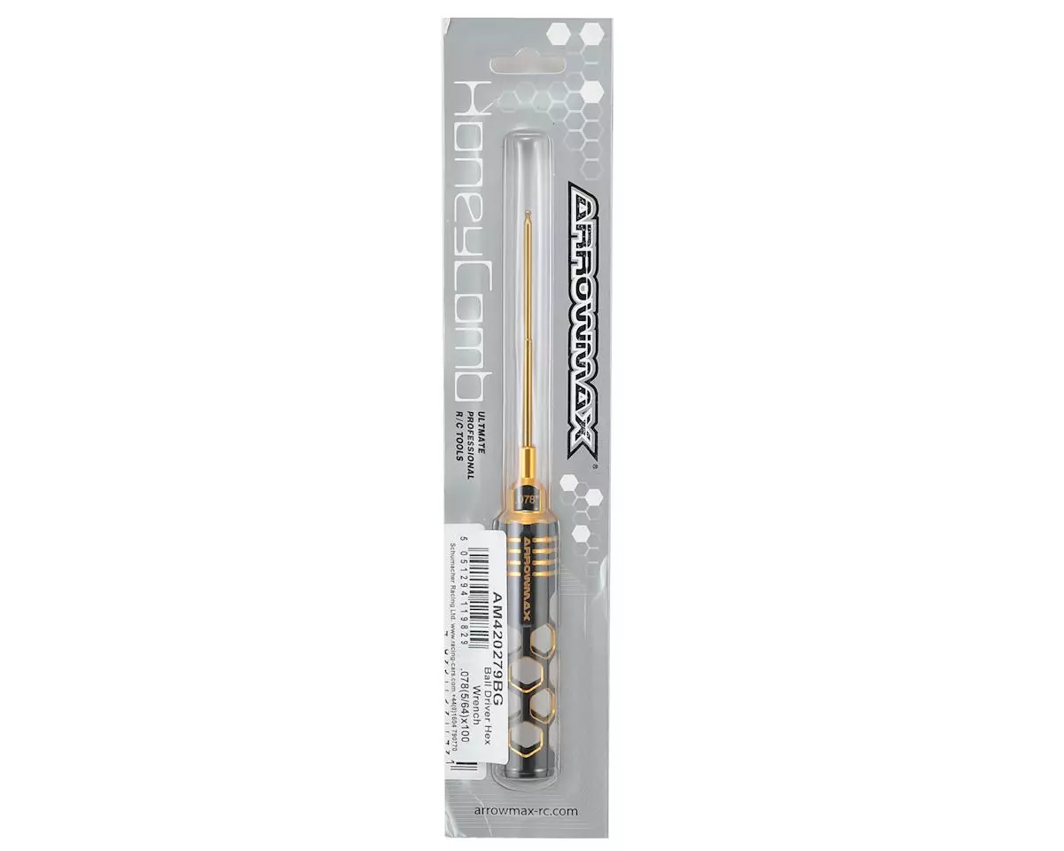 The Arrowmax Black Golden Ball End Hex Wrench is a limited edition tool that features an eye-catching hollow honeycomb handle design with a rich black and gold color finish. The 100mm long spring steel titanium nitride tip provides durability and long life, while a lexan end cap helps to create a more comfortable, controllable and lighter feeling tool that makes it easier to endure a long wrenching session. Package includes one 5/64″ ball end hex wrench.