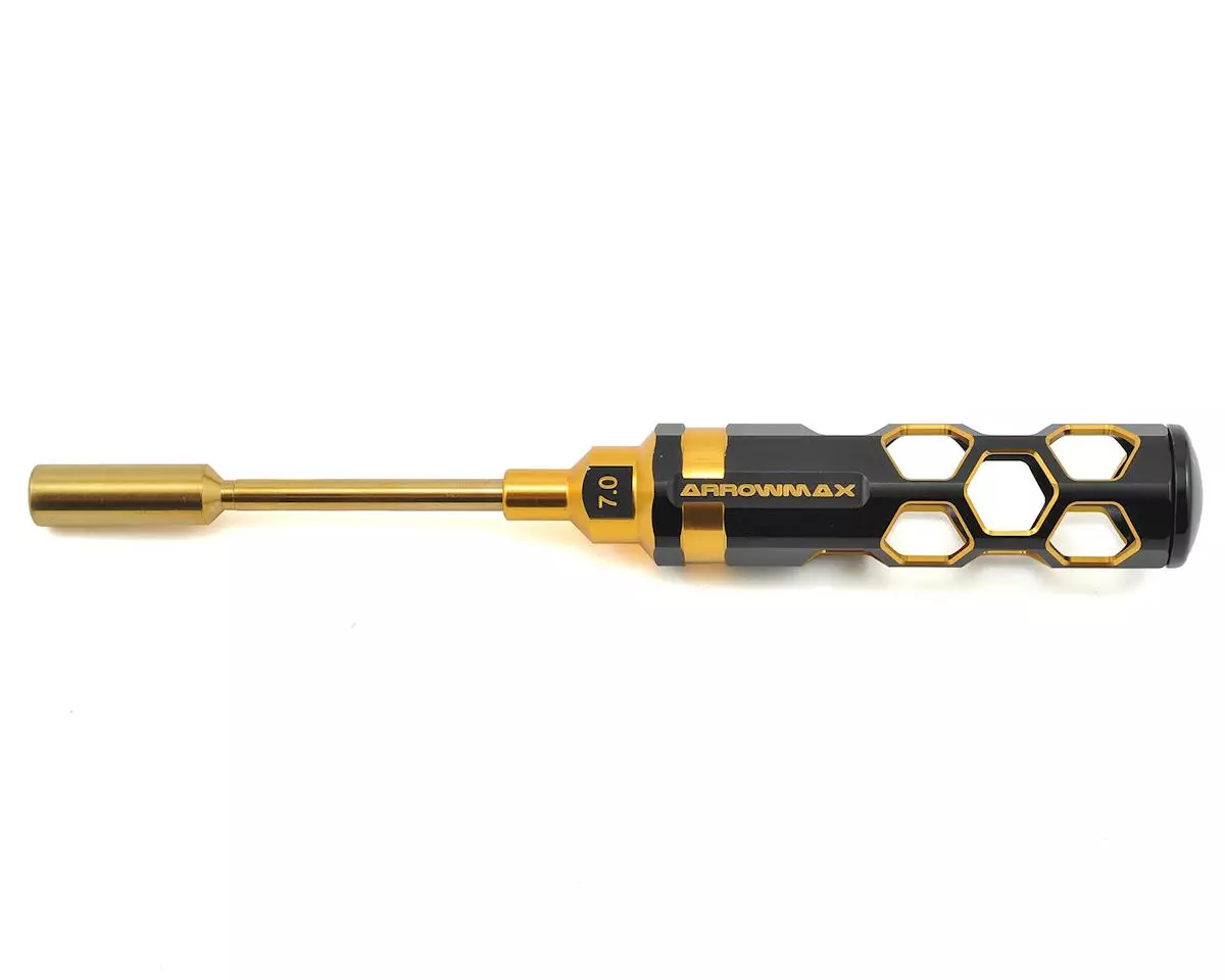 This is the Arrowmax Limited Edition Metric 7mm Nut Driver. This tool features an eye-catching hollow honeycomb handle design with a rich black and gold color finish. Spring steel titanium nitride tips and a bottom cover provide a more comfortable, controllable and lighter feeling.Â
