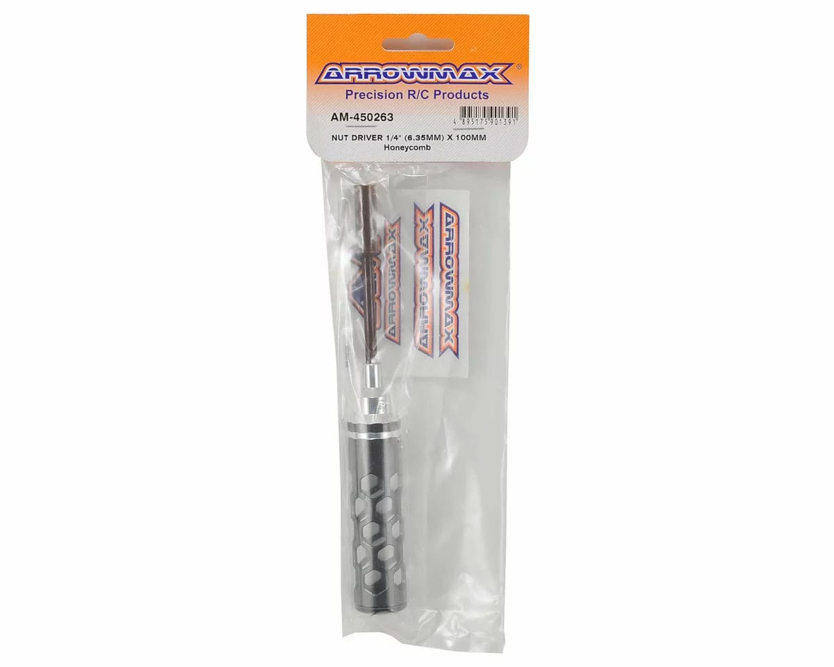 This is an Arrowmax 1/4″ Honeycomb Nut Driver. Arrowmax tools feature an eye-catching, light weight, hollow honeycomb handle design. The 100mm long tips are spring steel and titanium nitride coated for durability. When combined with the lexan cap, you get a comfortable, controllable and lighter feeling tool that makes wrenching easier.