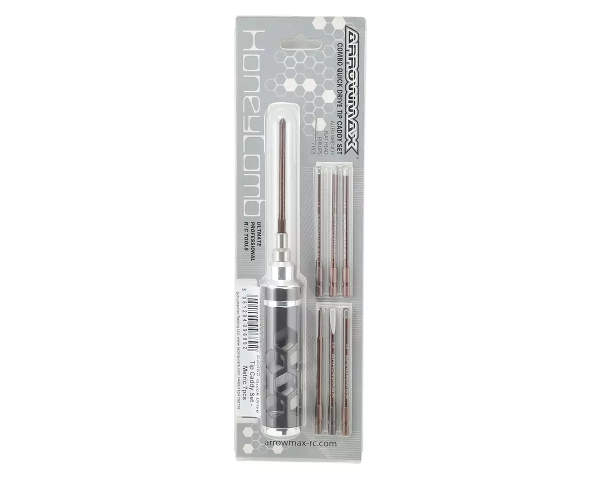 The Arrowmax Quick Drive Metric Tip Caddy Combo Set includes the four most common hex tips, as well as Phillips head and flat head screw drivers, all in 4mm drive, making them compatible with a power drill. A honeycomb machined handle is also included to allow you to use any of the tips like a standard hand tool.