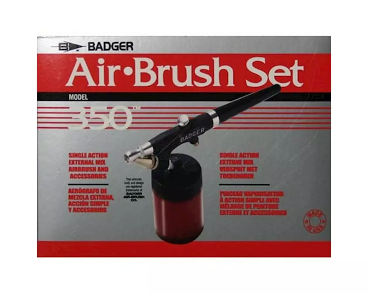 The 350® is an external mix airbrush. Air and paint mix outside the airbrush, creating a larger, coarser “dot” pattern and providing a heavier spray volume. The 350® is superb for base coating, stenciling, stipling, touch up projects, etc. An excellent choice for beginning students, hobbyists, ceramists, and automotive painters. This model sprays high viscosity materials such as ceramic glazes and stains, and hobby enamels with ease. It is also effectively used with properly reduced acrylics, inks, dyes, watercolors, acrylic lacquers, enamels, Air-Opaqueâ„¢, Air-Tex®, Spectra-Tex® and MODELflex® airbrush colors.