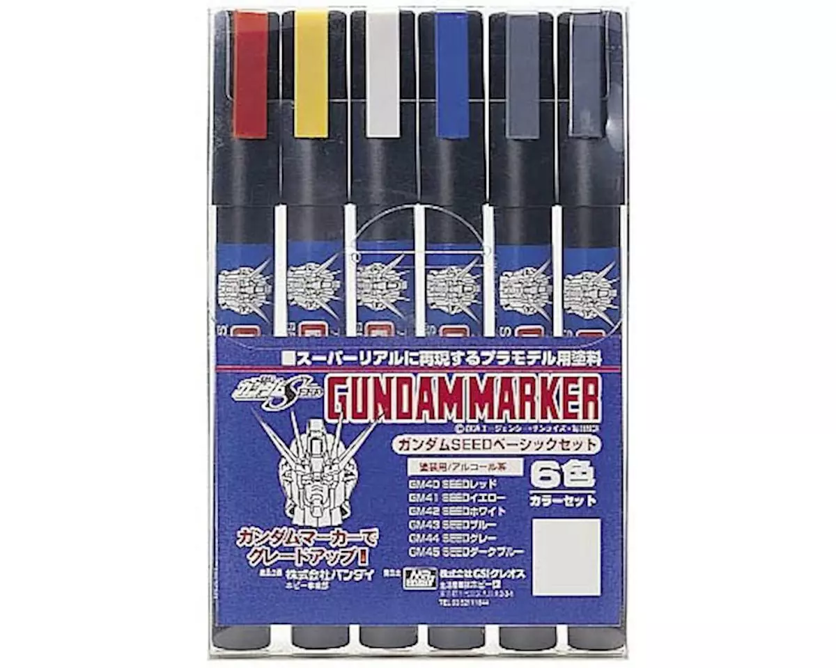 This is a pack of six Bandai Gundam Marker Seed Basic Set, used for outlining panels and adding details to completed Gundam kits.