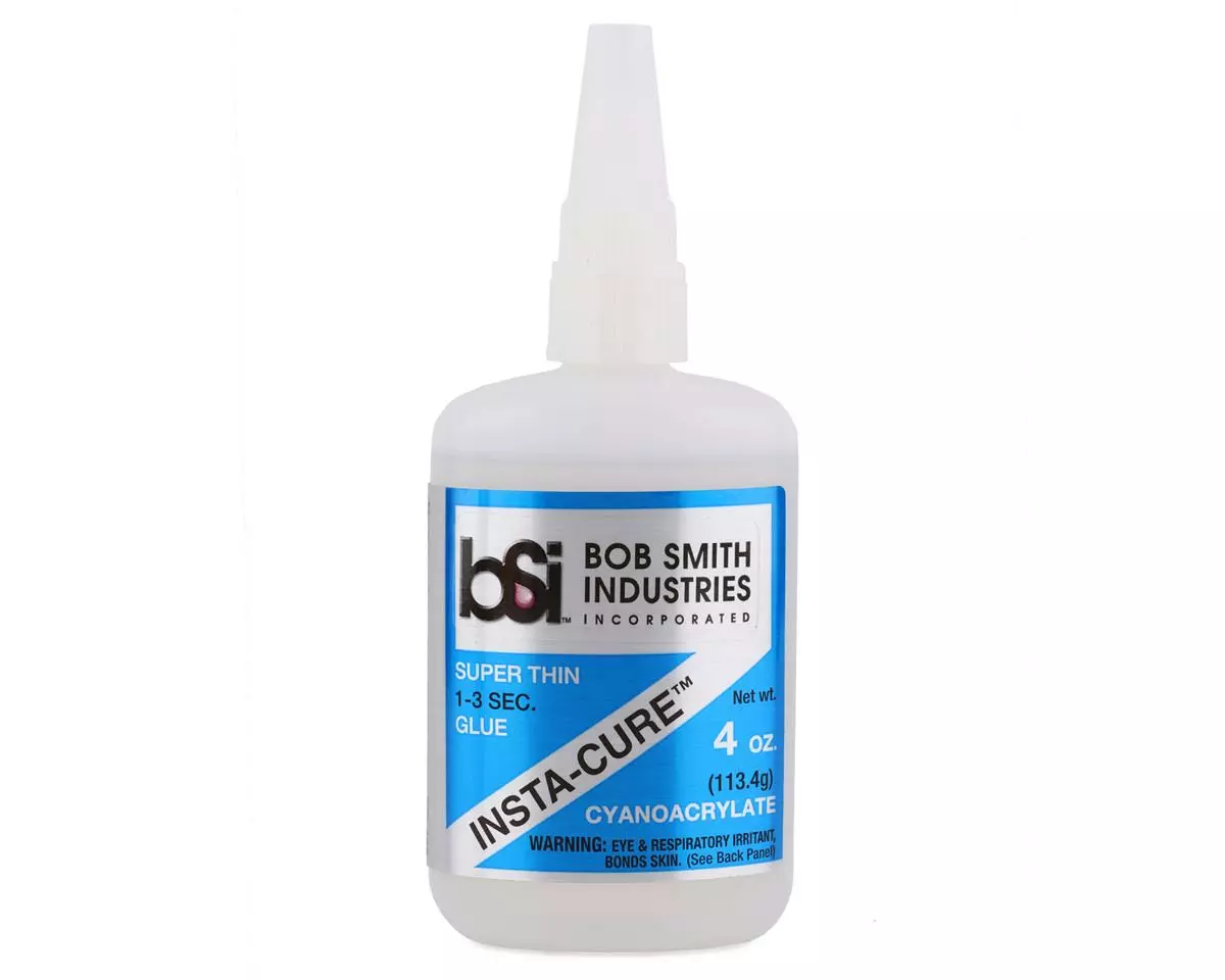 This is a four ounce bottle of Bob Smith Industries Super Thin INSTA-CURE CA Glue. INSTA-CURE has a water-thin viscosity that wicks deep into joints by capillary action and cures in a matter of a few seconds. Surfaces to be bonded must be tight fitting and should be held together while you apply the CA around the edges of the seam. At the moment CAs cure, they give off a vapor that can irritate the nose and eyes, so be prepared. Thin CAs work very well on balsa since they penetrate into the wood and form more than just a surface bond.