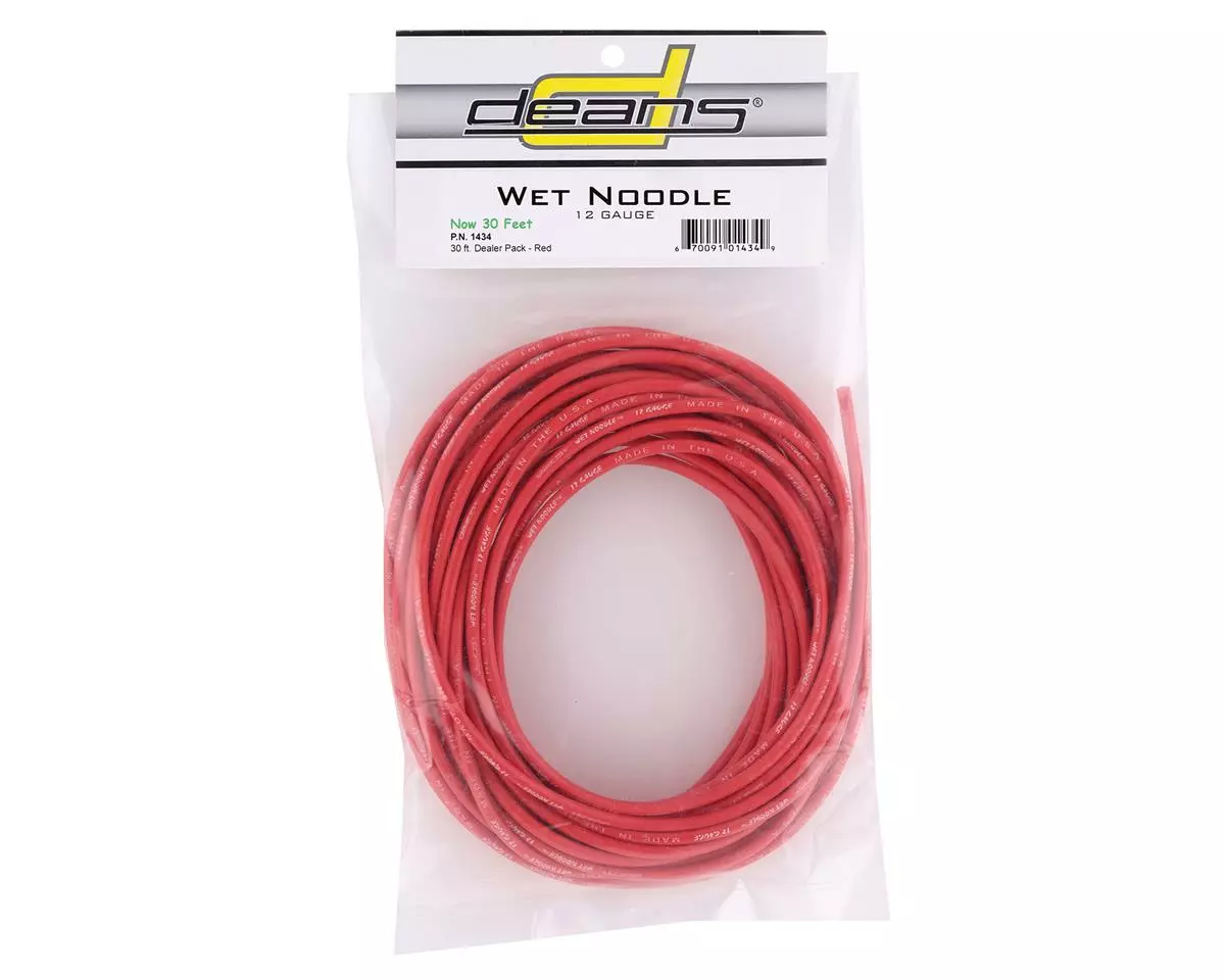 This Deans 12AWG Wet Noodle Wire is a thirty foot length of wire in red. Featuring the highest grade copper and pure silicone insulation this wire is extremely flexible, very strong and perfect for a variety of high current applications. Package includes one thirty foot length of red Deans Wet Noodle wire.