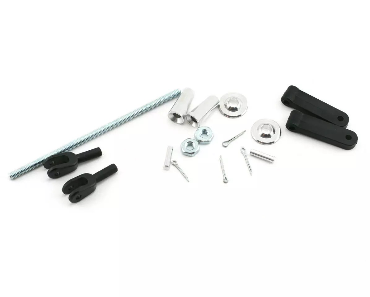 This is the Du-Bro RC Heavy Duty Dual Control Horn System for large aircraft .91 and larger. This control horn system comes complete with high quality aluminum horns, washers, steel 8-32 long shaft, nuts, horn arms, and cleveses (for 4-40 rods) with aluminum pivot pins.