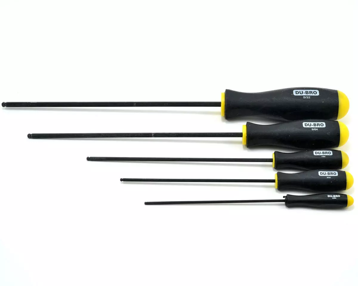 This is the Du-Bro Standard Ball Driver Set. The perfect tools for getting at those hard to reach places. Ball wrenches make it possible to turn socket head screws or bolts from any angle. Set includes one of each: 5/64, 3/32, 7/64, 9/64, and 5/32.