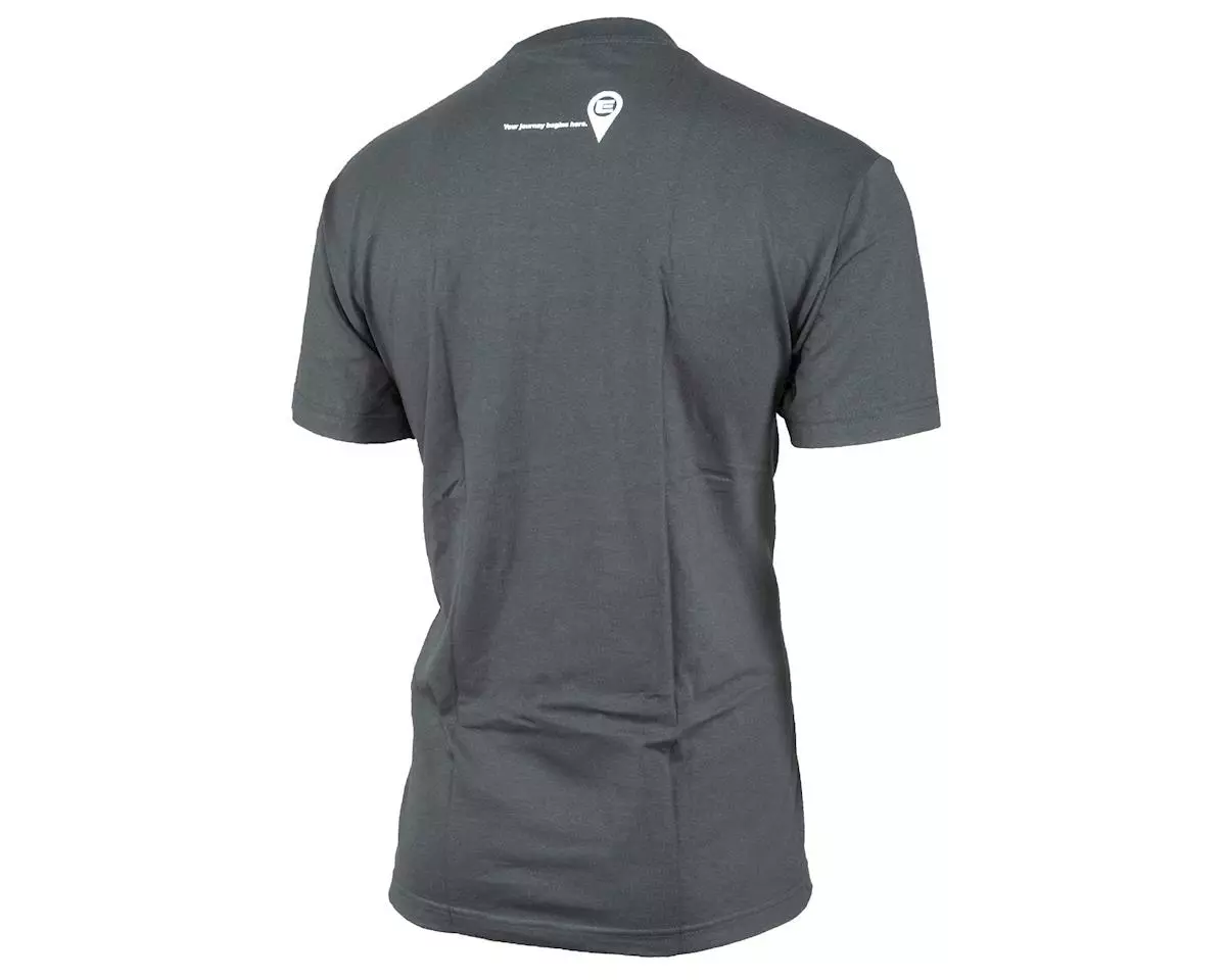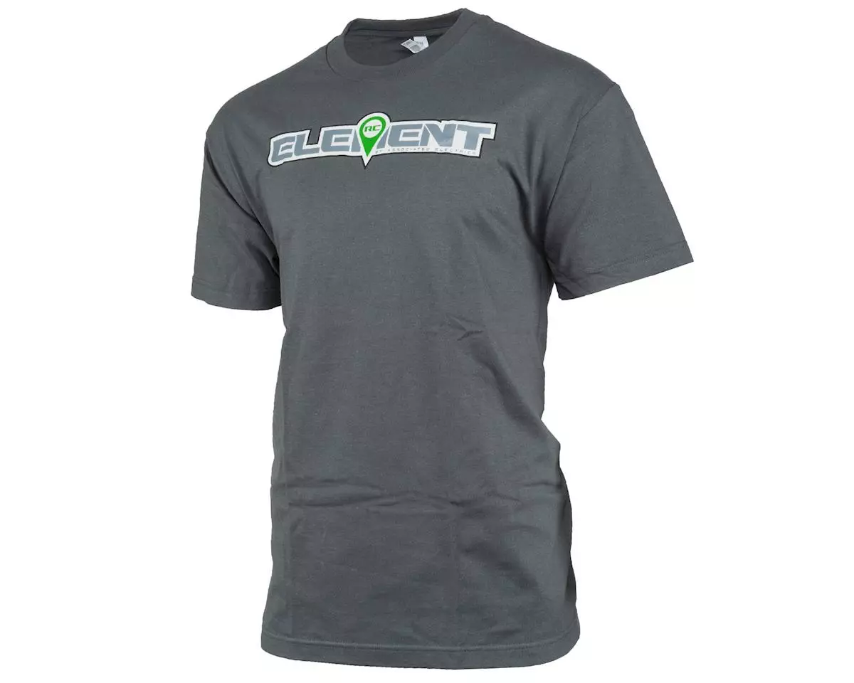 This is the Element RC Grey Logo T-Shirt, a 100% cotton t-shirt. This shirt has been preshrunk to be true to size and features a set-in rib collar with shoulder-to-shoulder taping and double-needle sleeve and bottom hem. The tear away label allows the wearer to remove the pesky, itchy tags. The “Element RC” logo is displayed in large white and green font. The Element RC “Your Journey Begins Here” logo is displayed in white between the shoulders on the back.