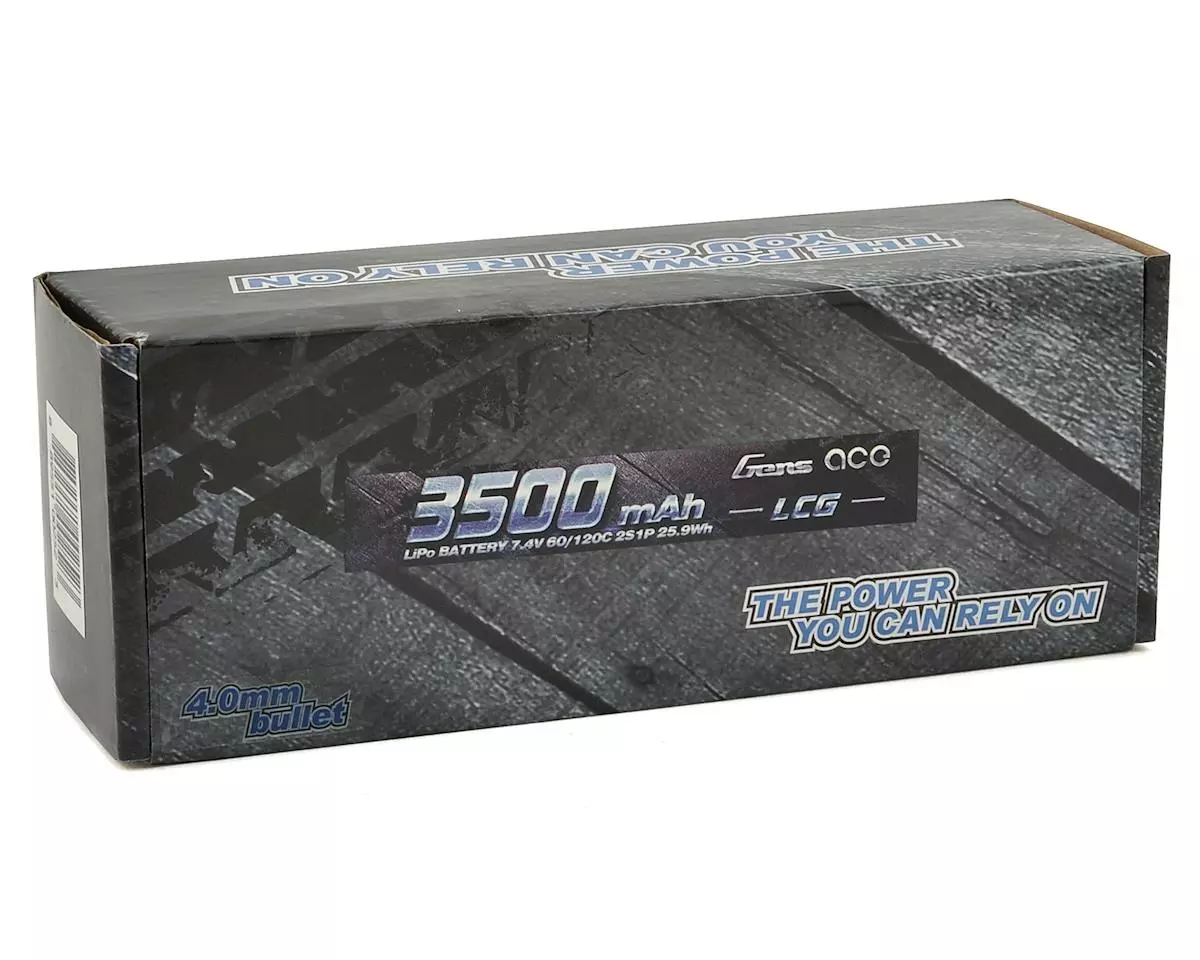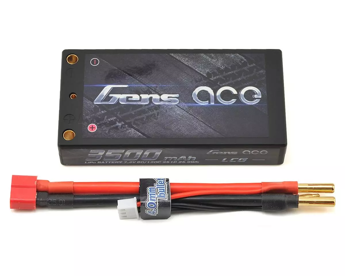 The Gens Ace 2S 60C 3500mAh Hardcase Shorty LiPo Battery Pack features 4mm bullets and includes an adapter cable with a factory installed T-Style connector. This is a high-capacity, high-discharge rate that gives you the power and run-time you expect from Gens Ace LiPo batteries.