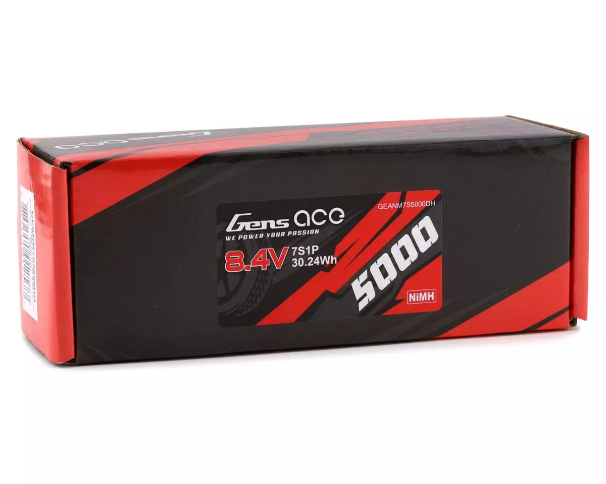 This is a Gens Ace 6-Cell, 7.2V, 5000mAh NiMH Battery Pack with T-Style Deans type Connector. This stick pack is built using quality Sub C size 5000mAh NiMH cells. This pack will fit into any vehicle that uses a hump style battery pack. The recommended charge rate for these batteries is 1C for the best battery life and run time, and we do not recommend you charge them at more than 1C (5A Max).
