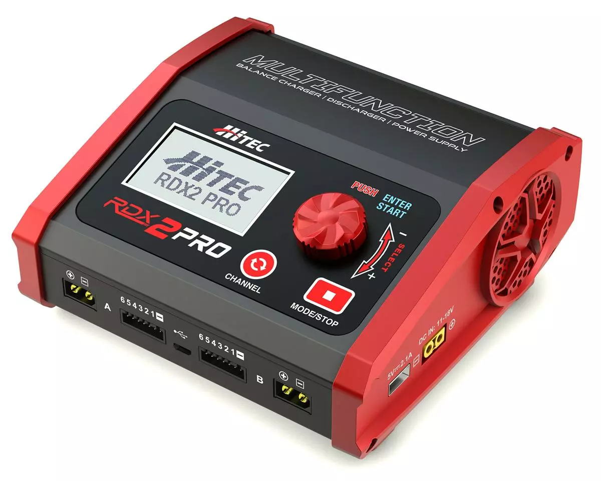 The Hitec RDX2 Pro AC/DC Multi Charger is a dual port AC/DC charger that delivers a whopping 260 watts of power! The RDX2 Pro features independent, 130-watt circuits, allowing you to charge two packs simultaneously. Its user-friendly Jog Dial easily scrolls through menus, making programming a breeze. Capable of charging 2S packs at rates up to 14 amps, and 4S packs up to 9 amps, the RDX2 Pro’s high charge rates provide more power in less time for your 1/8th and 1/10th-scale Buggy and Truggy needs.
