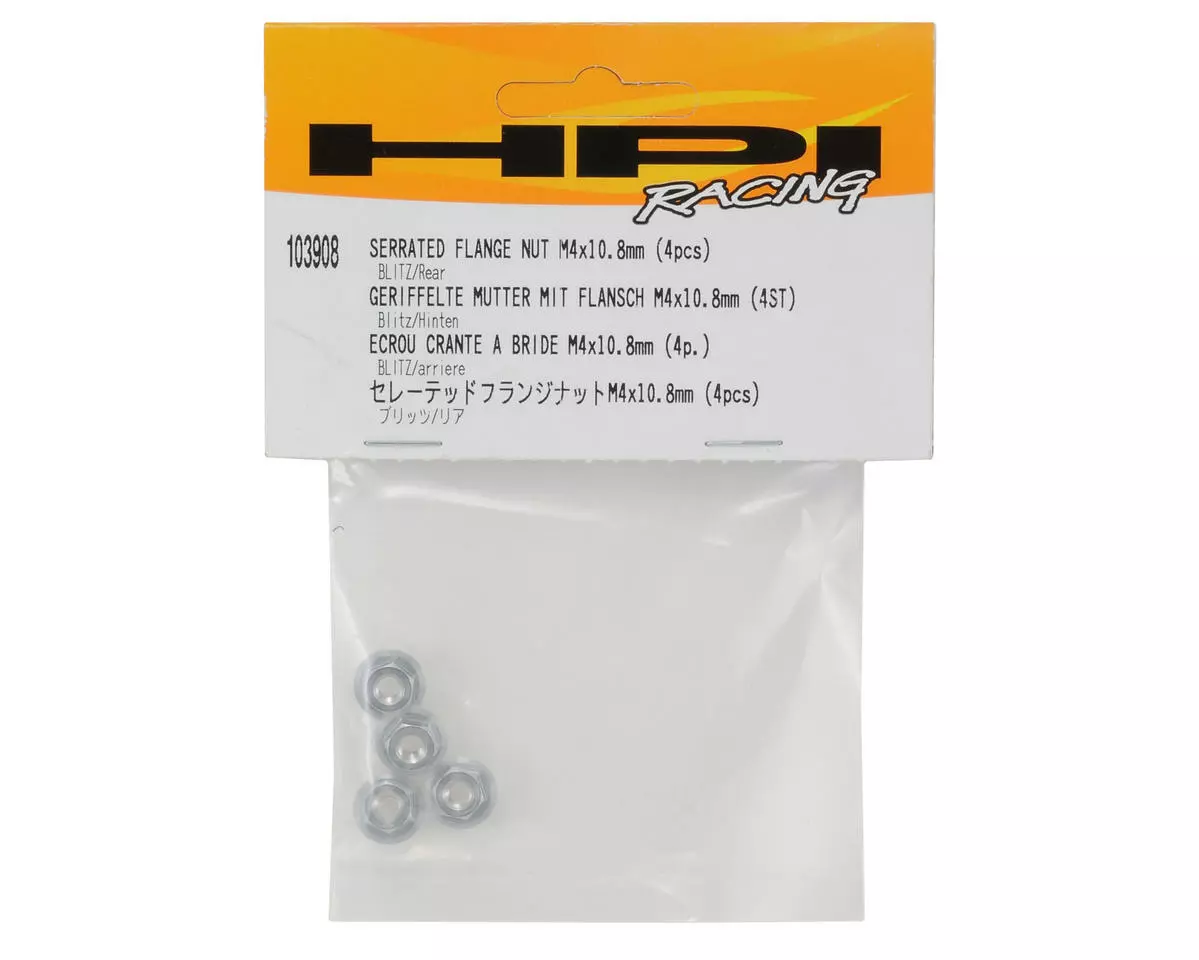 This is a set of four HPI 4×10.8mm Serrated Flanged Nuts, and are intended for use with the HPI Blitz short course truck. These are also and excellent option for any application that requires a 4×10.8mm Serrated Flanged Nut.