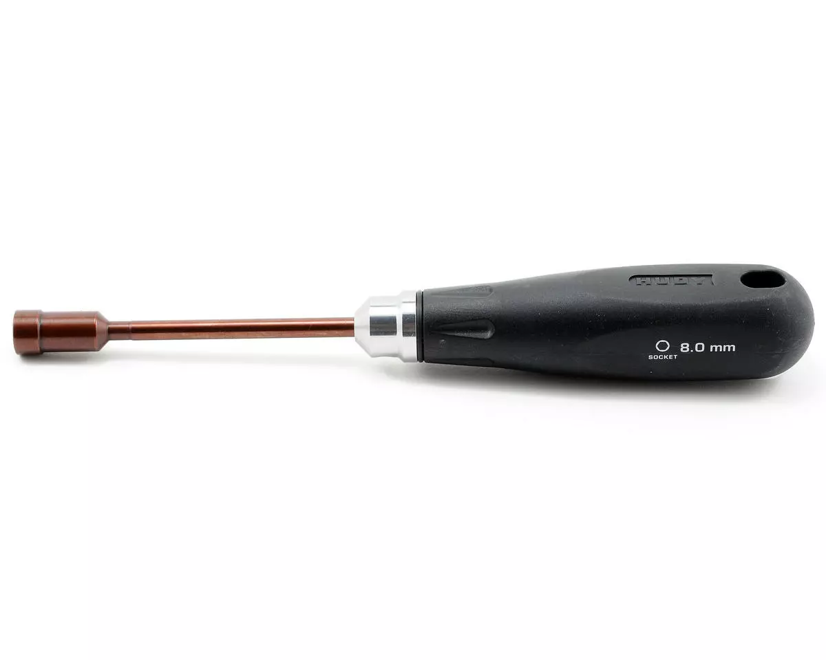 This is the Hudy 8.0mm profiTOOL Socket Driver. The HUDY profiTOOLS are based on highly-successful HUDY Professional Tools used by RC factory teams and world champions, and are available in most popular sizes and types. Each tool has a special, CAD-designed tip made of world-renowned HUDY Spring Steel(tm) to very precisely fit the corresponding fastener, allowing unmatched torque and long life. Lightweight, comfortable molded handles with machined hubs are designed to allow easy tip exchange.
