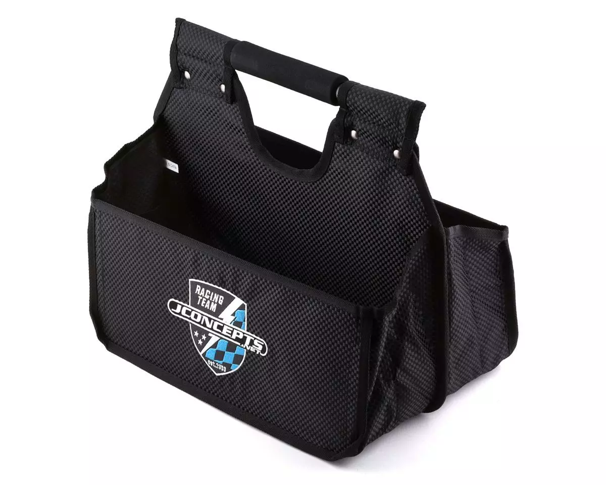 The JConcepts Finish Line Quick Access Nitro Pit Bag, is a great way to organize your area and have all your fuel accessories in one area. This bag is made from a woven high strength fabric fitted with a durable metal handle that boasts a stiff foam covering. Using this bag allows for two different location where fuel bottles can be cinched into position. JConcepts went the extra step and added a business card holder on the outside of the bag allows you to mark this bag as your own. Package includes one pit bag.