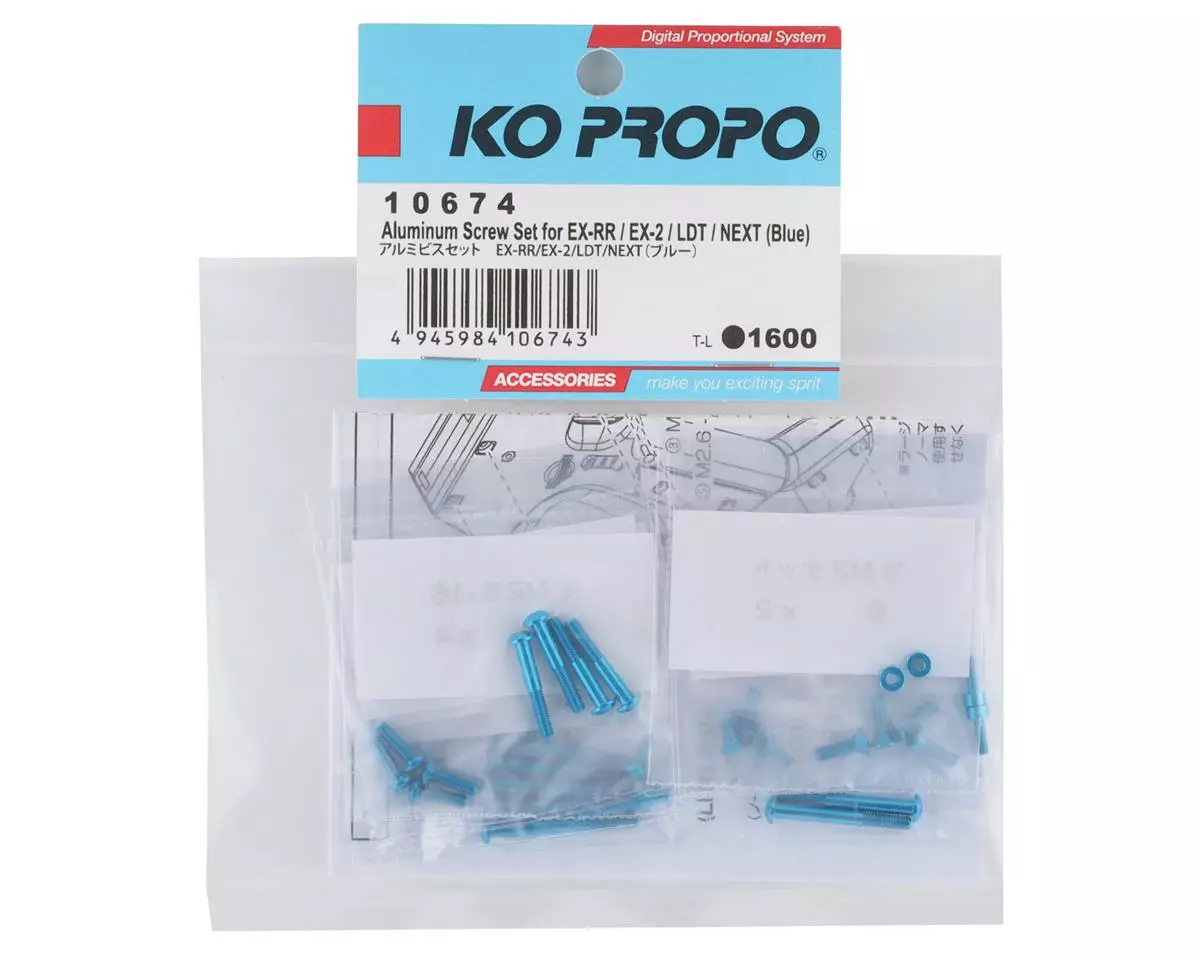 KO Propo EX-NEXT Aluminum Screw Set. Add some custom bling to your KO Propo transmitter with this optional screw kit. These aluminum screws are anodized deep blue and look amazing. While this kit is intended for the EX-Next it will work for the KO Propo EX-RR and EX-2 model transmitters. Package includes one complete screw kit with instructions.