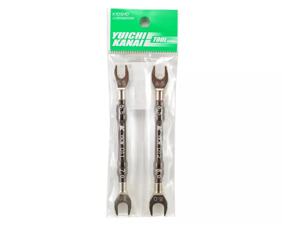 This is the Kyosho Yuichi Kanai Spanner Wrench Set. This combo pack includes both spanner wrenches that were developed by Yuichi Kanai, specifically for use with the Inferno MP9 series vehicles.