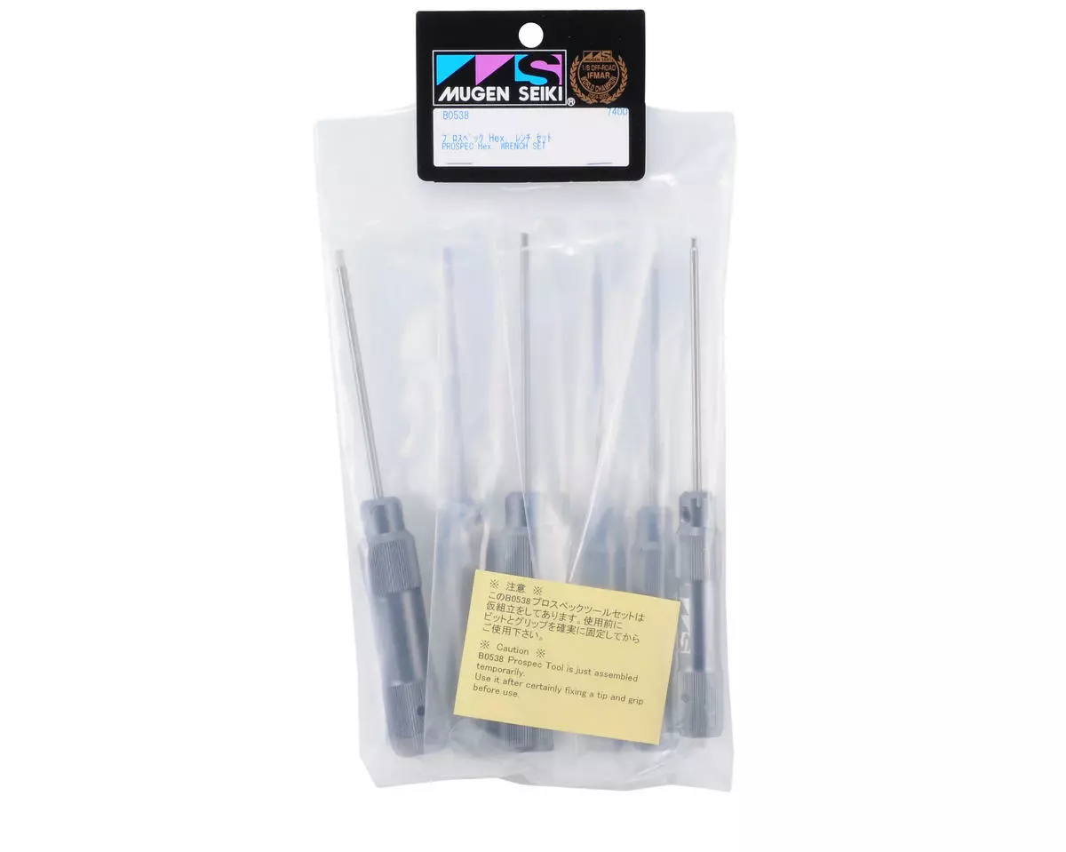 This is the Mugen ProSpec Allen Wrench Set. Featuring high quality CNC Machined, knurled handles and replaceable hardened steel tips. The handles on these tools are hollow to reduce weight and lessen fatigue, but also to allow the tips to be stored inside the handle to save space in your pit box.