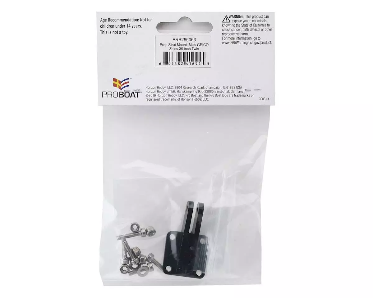This is a replacement Pro Boat Pro Strut Mount, intended for use with the GEICO Zelos 36. This pack includes one mount and hardware.