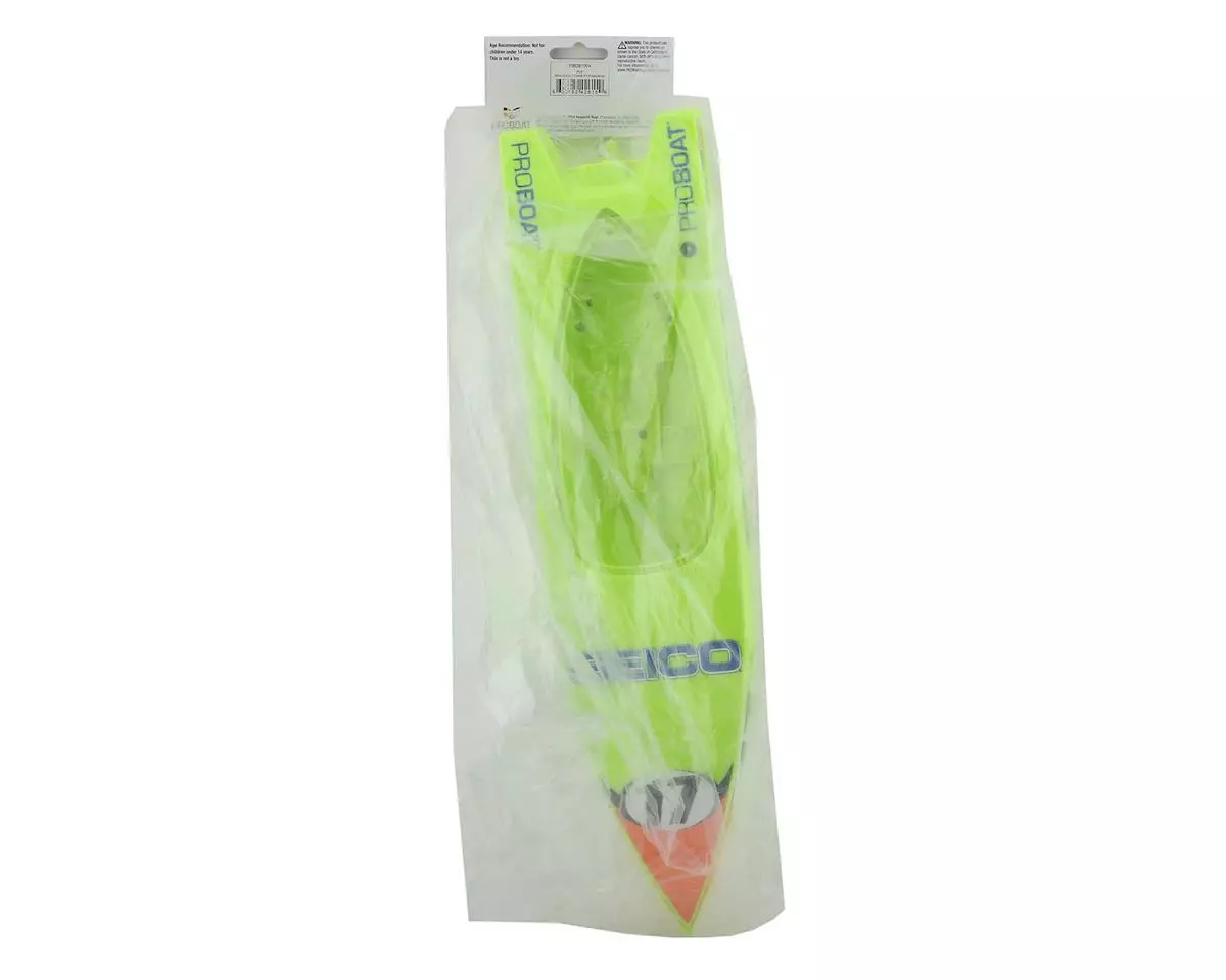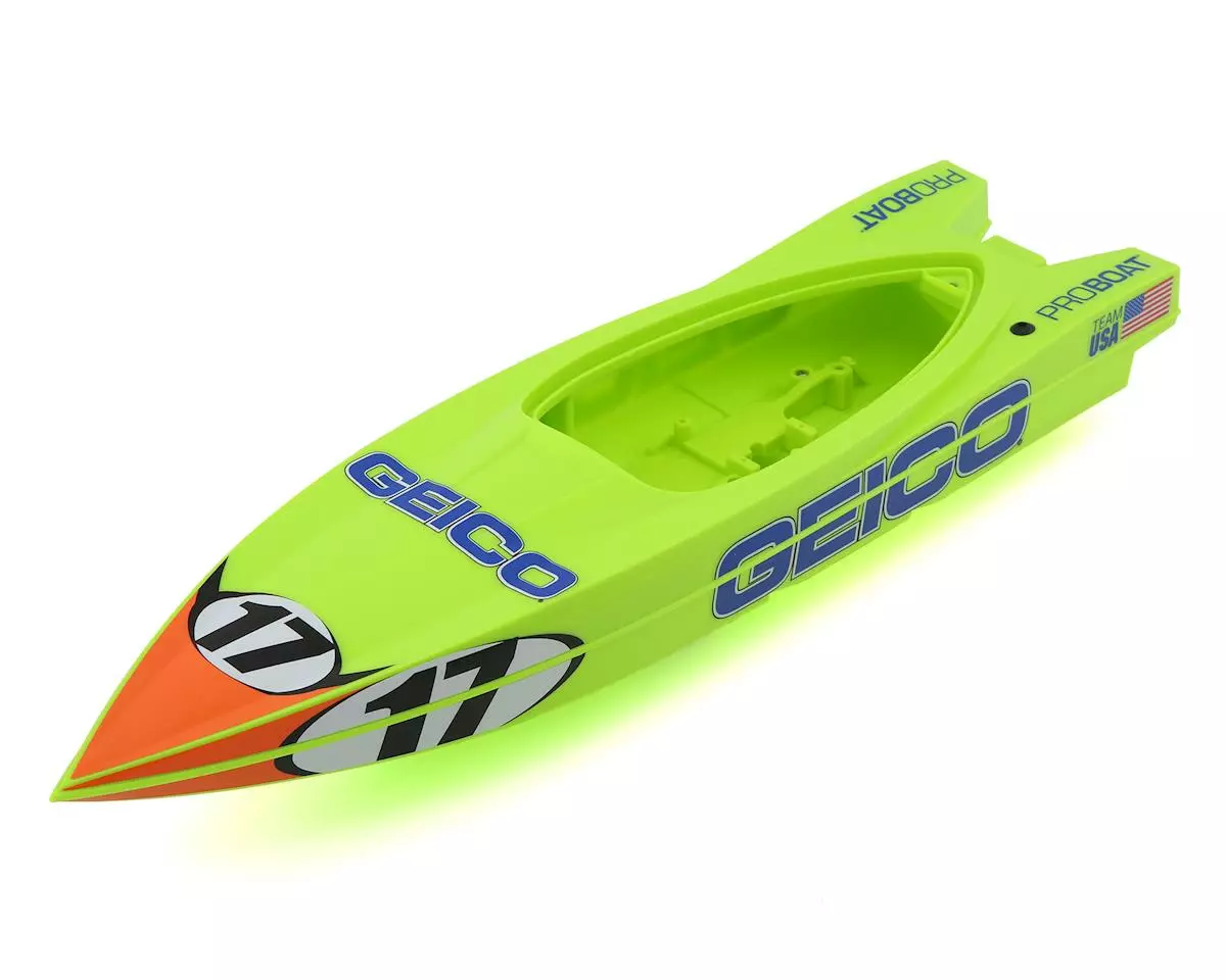 This is a replacement Pro Boat Miss Geico Power Boat Hull, intended for use with the 17″ Deep-V Power Boat Racer.