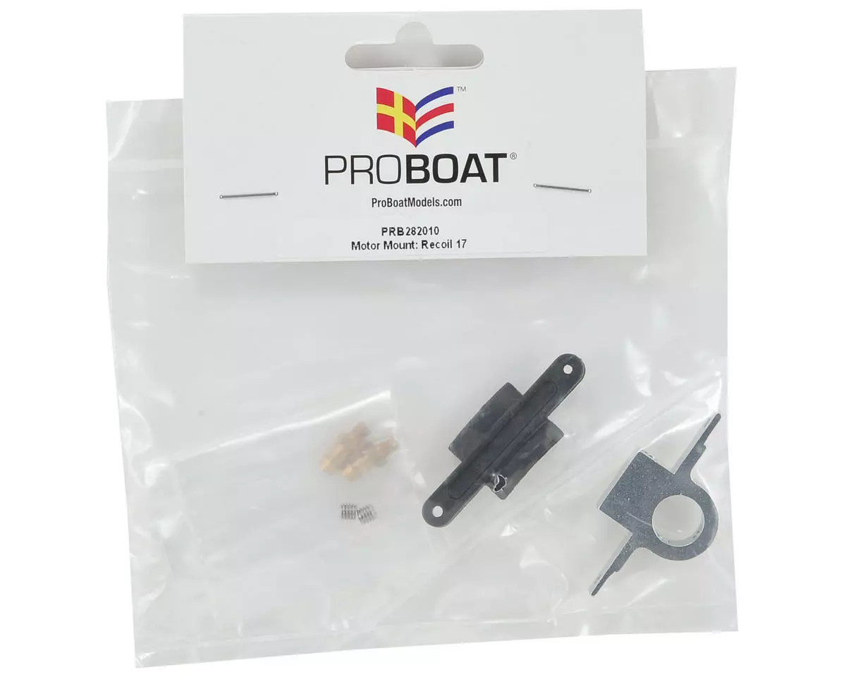 This is a replacement Pro Boat Recoil 17 Motor Mount Set. Package includes aluminum motor mount block, plastic motor holder, two brass nipples and two set screws.