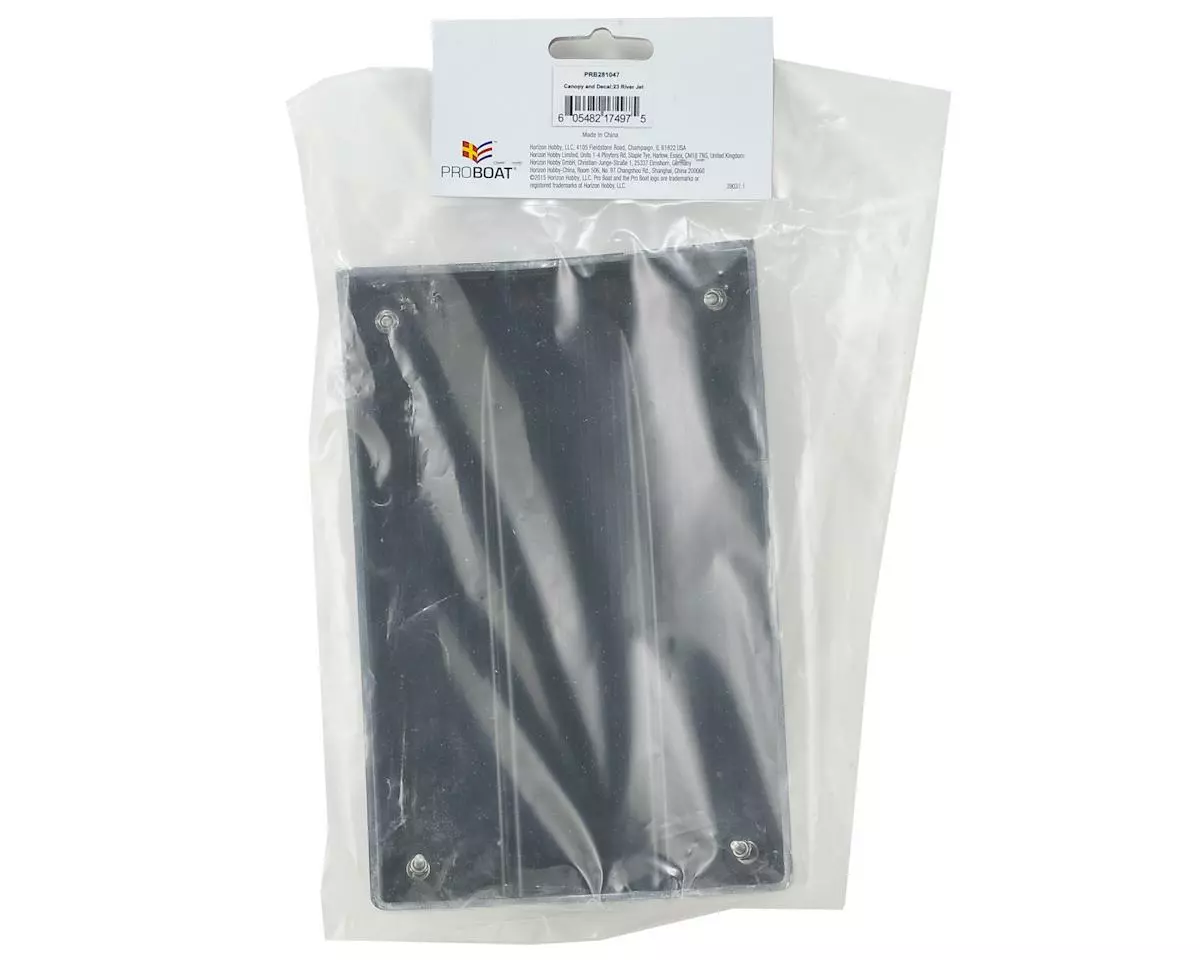 Pro Boat River Jet 23 Canopy & Decal. Package includes replacement canopy with factory applied decals and thumb screws.