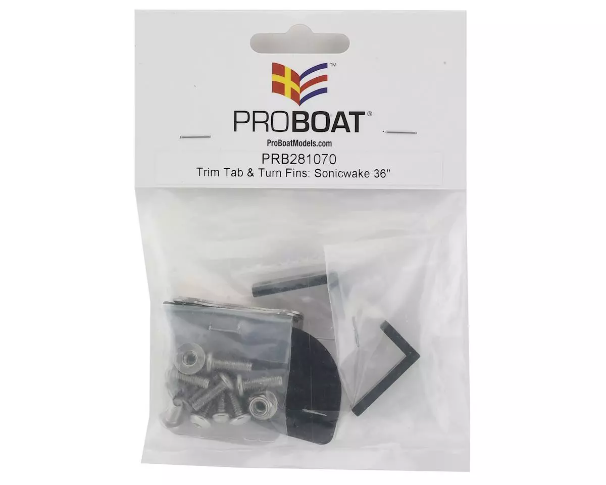 Pro Boat Sonicwake 36 Trim Tab & Turn Fin Set. Package includes replacement trim tabs, turn fins and hardware.