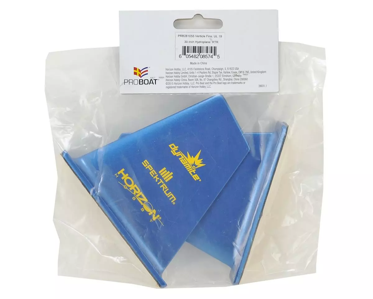 This is a pack of two replacement Pro Boat UL-19 Vertical Fins. These blue fins feature applied decals and double sided sticky tape on the base.Â