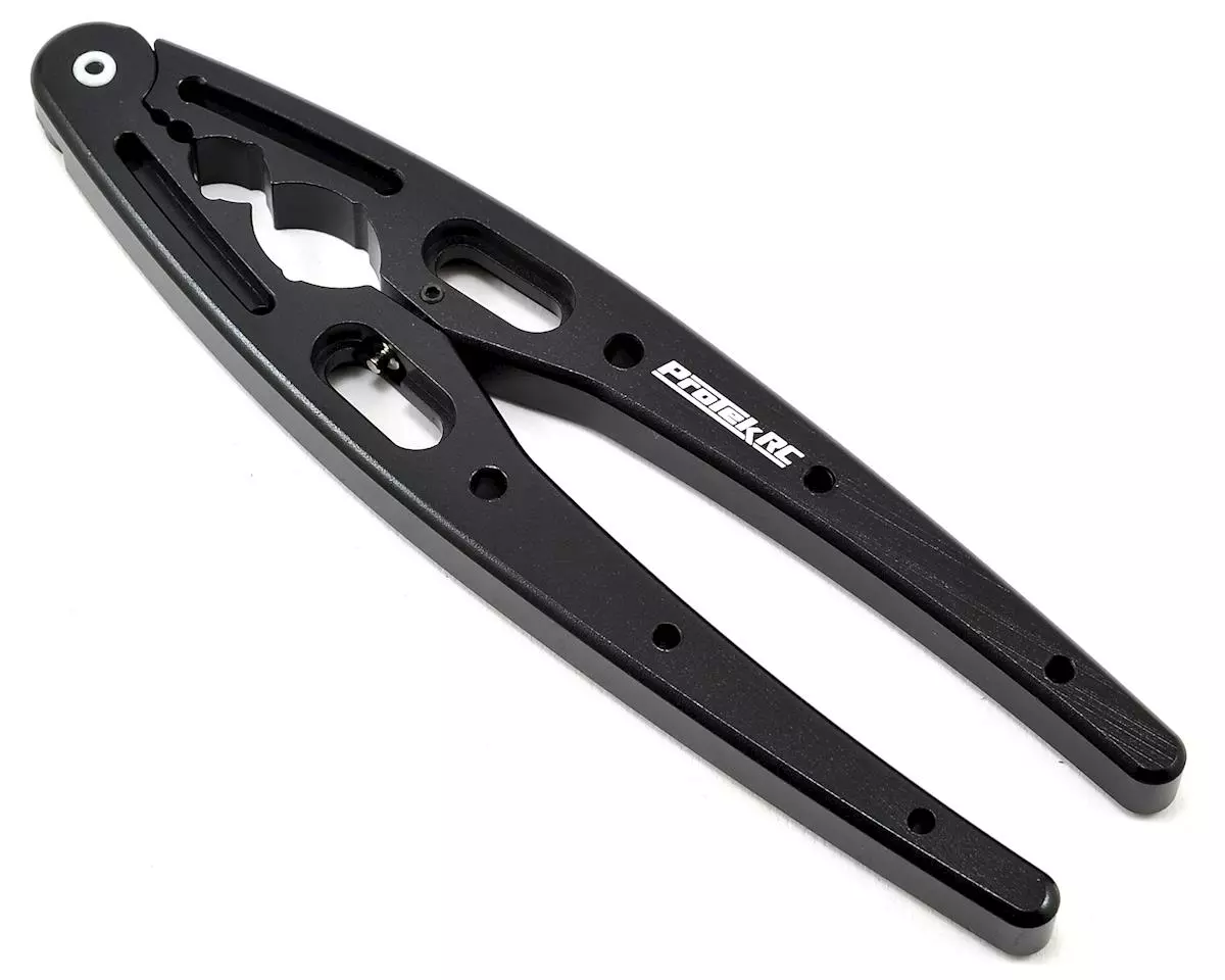 The ProTek R/C “TruTorque” Shock Shaft Pliers are for use with 1/10 and 1/8 scale shocks and are made from lightweight aluminum material and finished with a silky black anodize. The pliers feature a “nutcracker” style construction which eliminates any hard or sharp edges that could potentially cause damage. This style also provides increased leverage while providing the user with a direct feel for the amount of pressure being applied.