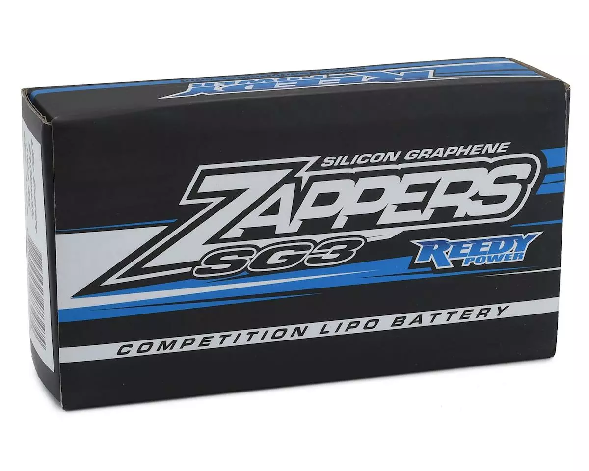 The Reedy Zappers HV SG3 2S Low Profile Shorty 85C LiPo Battery focuses an emphasis on lower internal resistance with improved durability and cycle-life. Zappers SG3 batteries feature a 7.6 nominal voltage, which means that the battery can be safely charged to 4.35V/cell. Even when the typical 8.40V (4.2V/cell) charging limit is enforced, Zappers SG3 cells perform thanks to their inherently flat discharge curve, which results in higher voltage deeper into the race.
