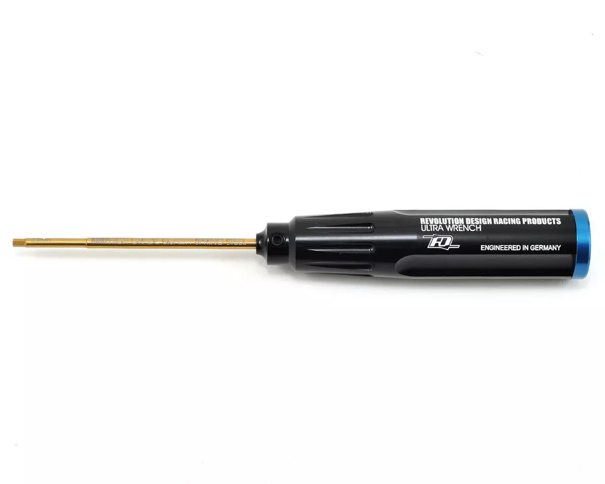 This is the Revolution Design Racing Products 2mm Ultra Wrench. Revolution Design Ultra Series wrenches feature a machined 7075 T6 handle that provides a great grip for your hand, while helping to reduce fatigue and eliminate the chance of blisters after hours of wrenching. The handle is black hard-anodized, with a laser etched RDRP logo.