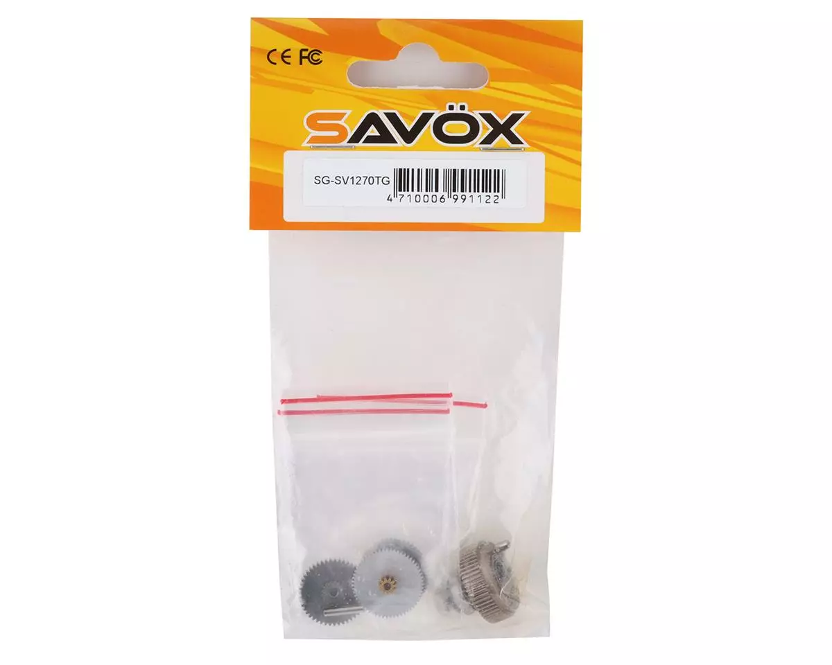 Savox SV1270TG Servo Gear Set with Bearings. These are replacement gears intended for the Savox SV-1270TG. Package includes one complete gear set with pins and bearings.