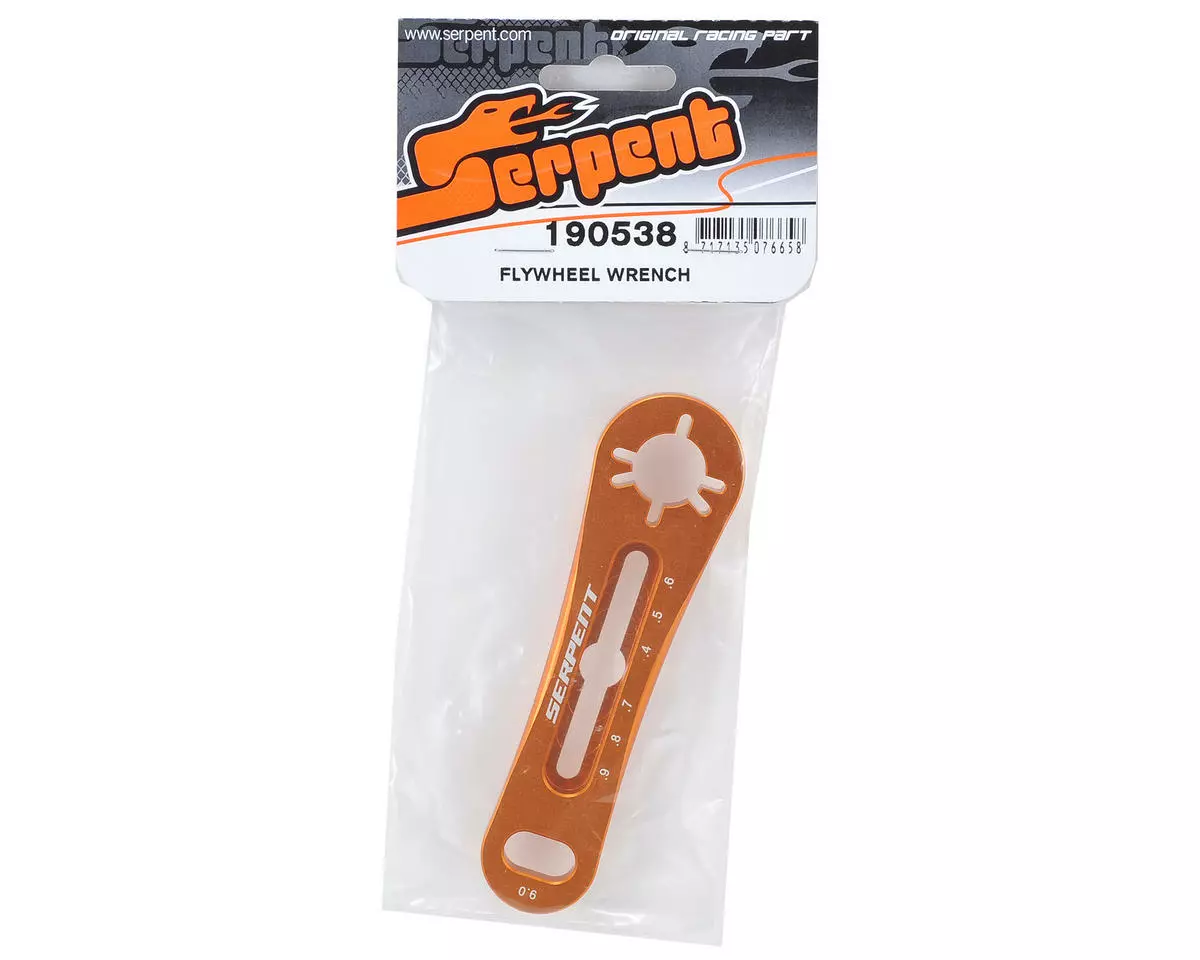 This is the Serpent Flywheel Wrench. This billet aluminum wrench features a combination 3 and 4 pin flywheel wrench, with a 9mm slot on the opposite end and a slot through the center that will allow you to measure your clutch gap between .4 and .9mm.