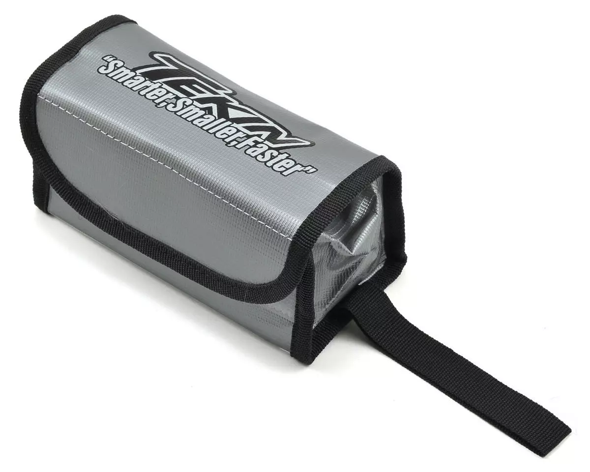 This is the Tekin “LiPo Safe” Li-Poly Battery Charging Sack. Constructed from flame resistant fiberglass, the Tekin LiPo Safe is a must have accessory and safety device in your pit setup. Charging and storing LiPo cells should be done in a flame resistant enclosure at all times. The Tekin LiPo Safe will store two 2S LiPos or one 4S, 5S or 6S LiPo.