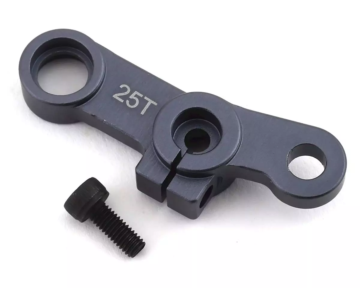 This is an optional Tekno RC NB48 2.0 Aluminum 23T Throttle Servo Horn for Protek, Savox and Futaba Transmitters, intended for use with NB48 2.0 1/8 Competition Off-Road Nitro Buggy Kits. Eliminate the possibility of your servo horn stripping, coming off, or your brake and throttle going out of adjustment and causing a runaway. Not only is this laser-etched servo horn made from aluminum and inherently much less likely to strip or flex, but it also clamps and grips the servo output shaft tightly to help prevent it from falling off or losing adjustment. In addition, this updated servo horn is designed with a slight angle between the brake and throttle lever, which provides a more consistent braking force through the servo’s rotation. The aluminum horn is a direct replacement for the stock composite horn (TKR9392), uses the same 5x8x2.5mm bearings and brake linkage, and is for use on the 2.0 series of nitro vehicles.