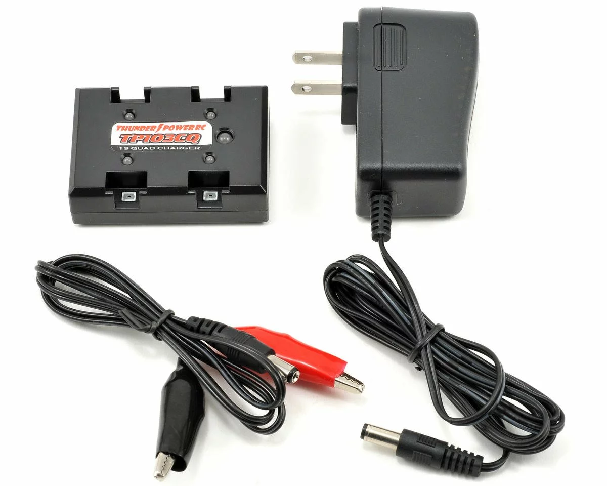 This is the Thunder Power TP103CQ-ACDC 1S LiPo Quad/4-Port 12V AC/DC Charger. The Thunder Power RC TP103CQ-ACDC combo is the ideal, pocket-sized charger and power supply setup to charge the 1S 3.7V LiPo batteries typically used to power ultra-micro and similar class airplanes, helicopters and other models. The TP103CQ quad (4) port charger can be easily and conveniently powered from a 100-240V outlet using the included TP1201P AC to DC, 1-amp power supply, while the included DC input power leads can be connected to a typical 12V Pb/lead acid/gel cell battery for charging on the go. The charger features four ports that operate independently and allow you to charge up to four batteries simultaneously at a rate of 0.3A per port.