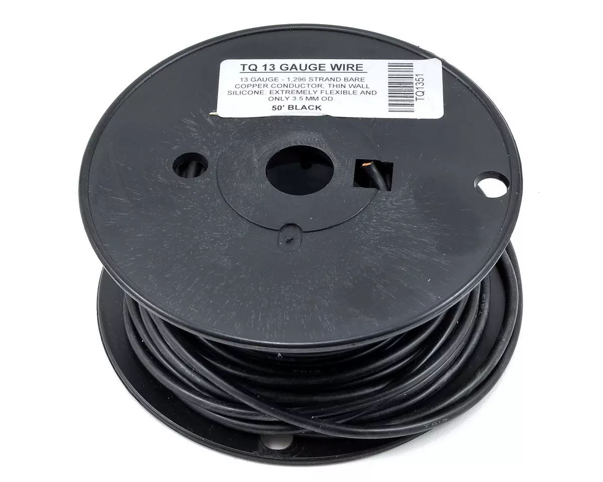 This is a fifty foot roll of TQ Wire 13awg Silicone Wire. TQ 13 Gauge wire is constructed with 1,296 strands of bare copper and thin wall silicone. This wire has a 3.5mm outer diameter, making it as thin as most 14 gauge wire and delivers more power! The compact 13 gauge conductor easily fits into ESC’s and BL solder terminals, is thin and super flexible, making it easy to make quick work out of neatly wiring any car.Â