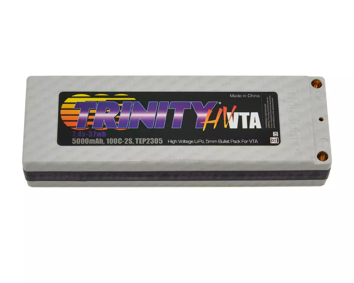 This is the Trinity Hi-Voltage 2S, 5000mAh “VTA” Li-Poly 100C Hardcase Battery Pack with 5mm Bullet Connectors. Developed for VTA spec racing, with feedback from the worlds fastest spec class racers, these are Trinity’s best racing packs.