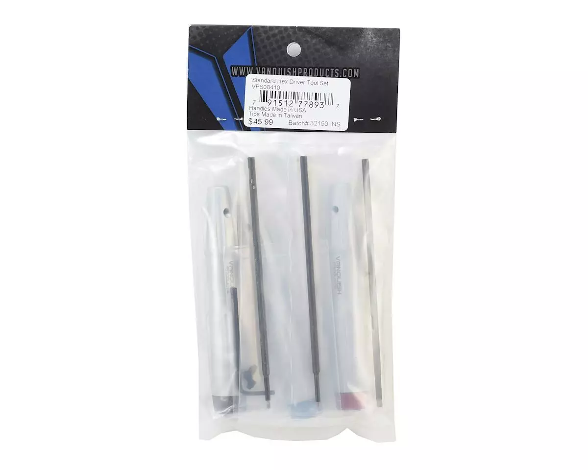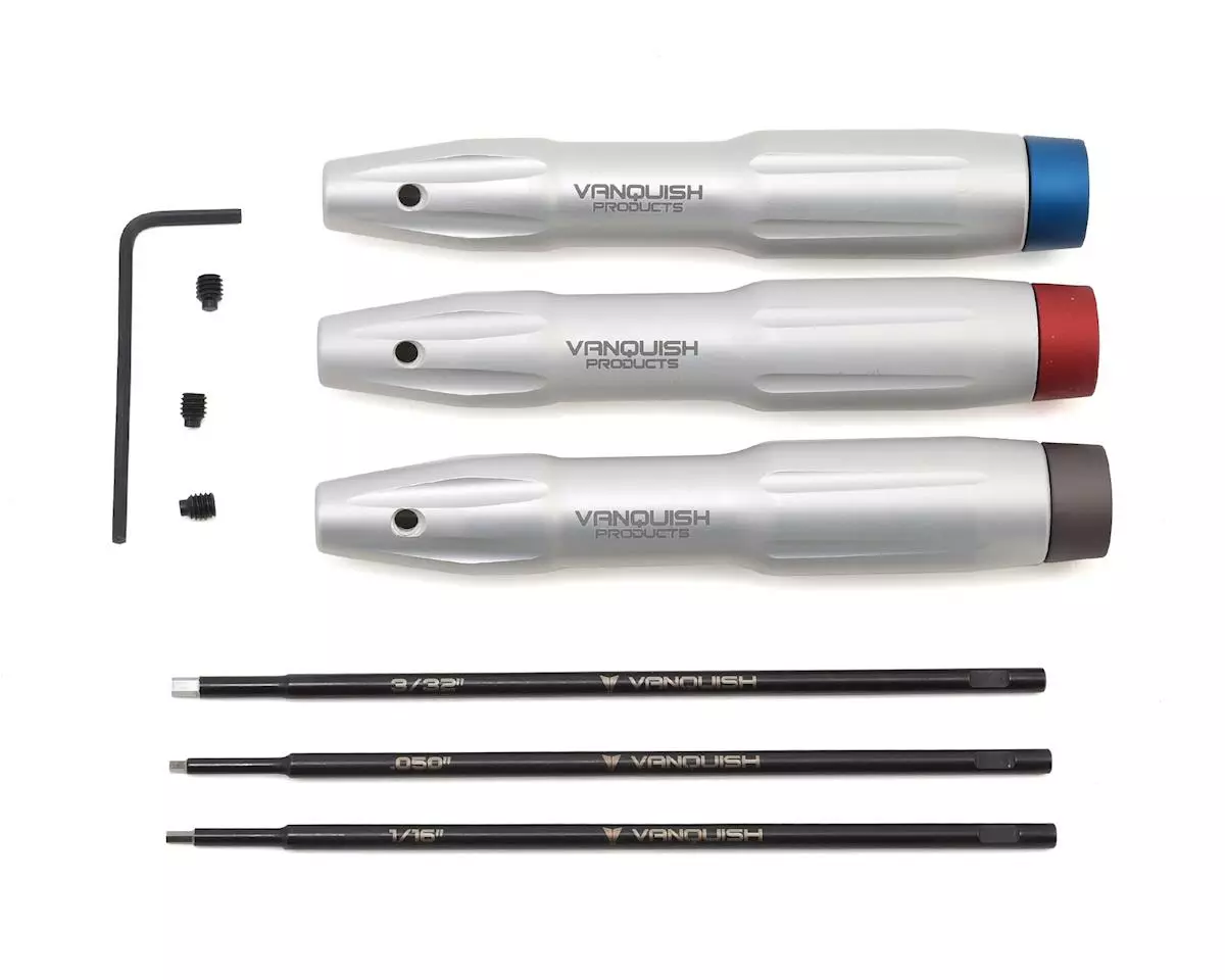 The Vanquish Products Standard Tool Set features machined aluminum handles with a bearing supported cap for comfort while working. Each cap is anodized a different color for quick visual identification. The tool tips are laser etched with the Vanquish Products logo and tool tip size.