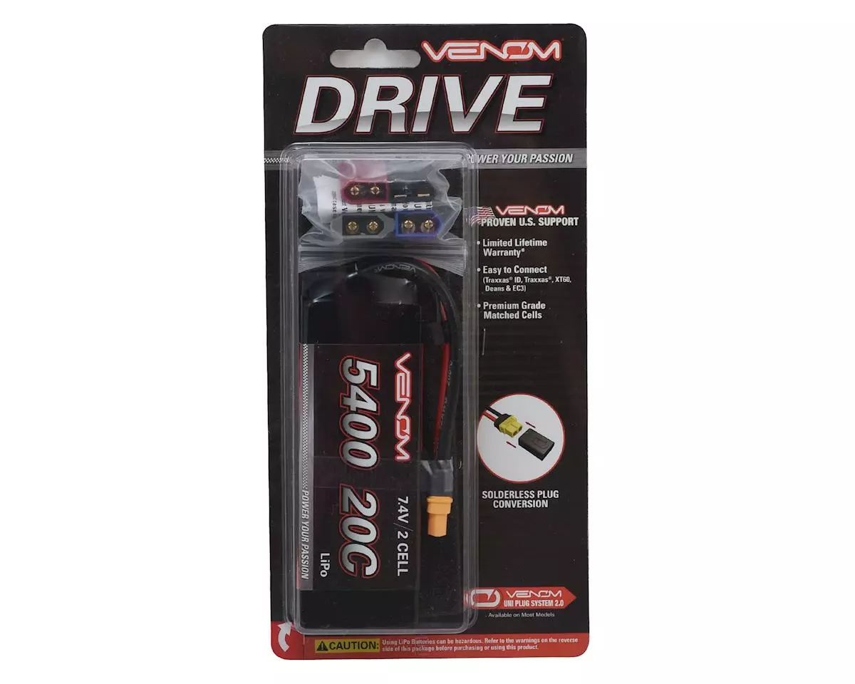 The Venom 20C 2S 5400mAh 7.4V LiPo Battery pack delivers performance and power. Developed to power a wide variety of remote-controlled products from your short course truck, buggy, monster truck, heli, jet, airplane or quad.
