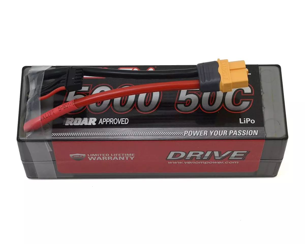 The Venom 50C 4S 5000mAh 14.8V LiPo Hard Case ROAR Approved battery has the same quality features you have come to depend on from Venom: 10 AWG soft silicone wire leads with their patented High Current UNI 2.0 Plug System, along with the power to handle even the toughest terrains.