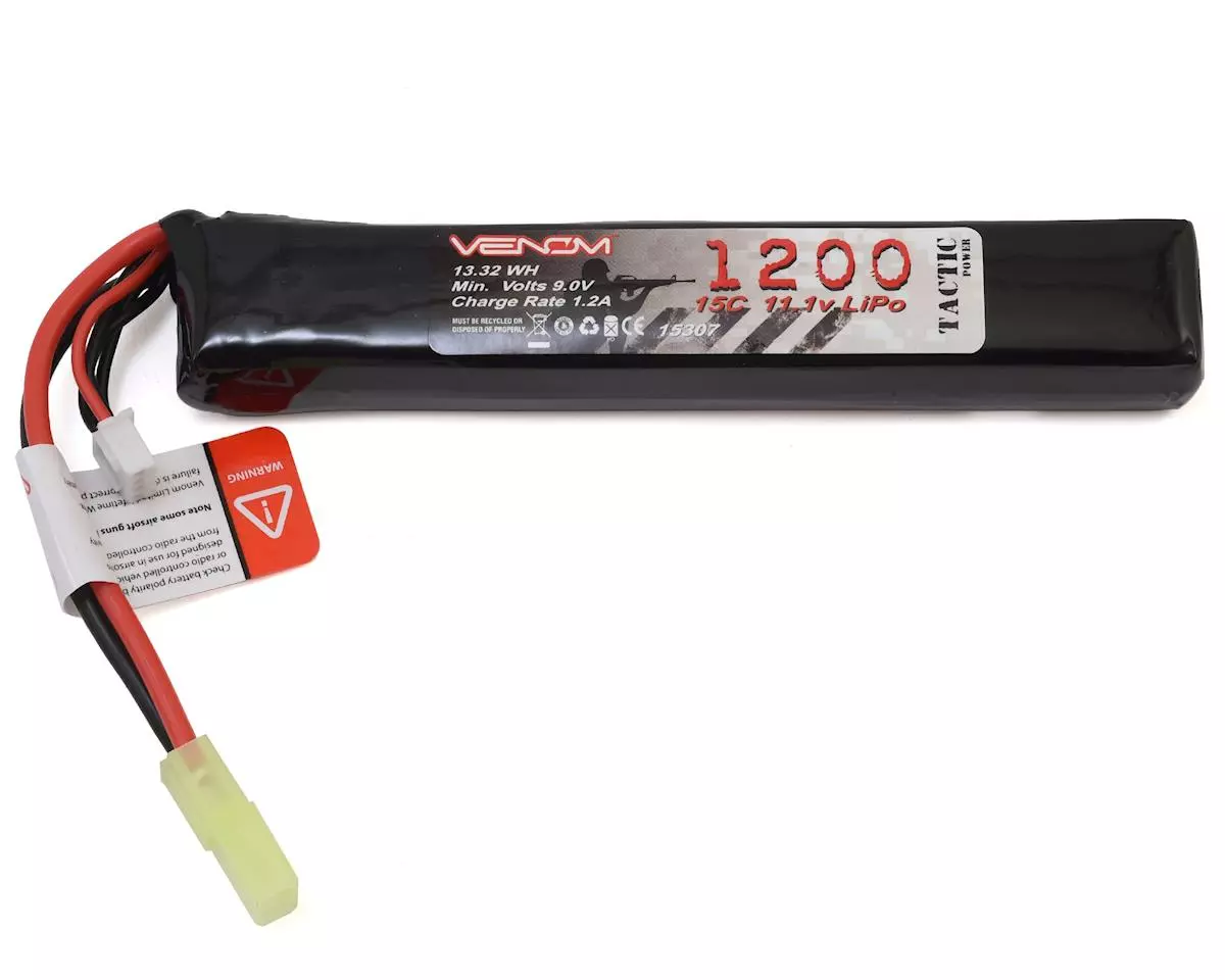 This is the Venom 3S 11.1V 1200mAh 15C LiPo Battery for Airsoft Guns. **IMPORTANT-Venom Tactic Power Airsoft batteries are wired with REVERSED** **POLARITY from the radio control industry standard.** **Always double check polarity of the airsoft gun** **or R/C vehicle before use.** COMMENTS: READ the ENTIRE instructions printed on header card before use ALWAYS use a LiPo-approved charger ALWAYS use a LiPo Cell Balancer NEVER Charge over 4.20V per cell NEVER Charge at currents greater than 5C NEVER Trickle Charge NEVER allow to Discharge below 2.5V per cell NEVER disassemble or modify pack wiring in any way or puncture cells NEVER place on combustible materials or leave unattended during Charging ALWAYS charge in a fireproof location ALWAYS set charger’s output volts to match battery volts ALWAYS keep out of reach of children jxs 01/31/12 ir/jxs