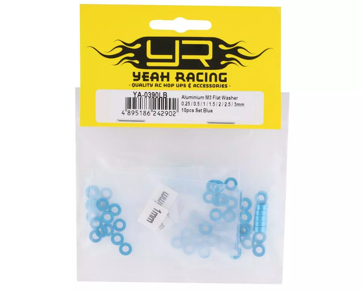 Yeah Racing 3×0.25/0.5/1.5/2/2.5/3mm Flat Washer Set. These optional washers are made from high quality aluminum and anodized blue for a clean look.